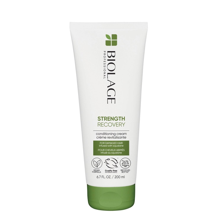 Biolage Strenght Recovery регенеративниот балсам за коса инстантно се грижи за оштетената коса. Балсамот има веганска формула која е создадена од 97% состојќи од природно потекло за интензивна нега и намалување на кршливоста на влакното. Се препорачува за постигнување видливо подобрена текстура на косата. Производот е вегански, не е тестиран врз животни. без сулфати и од 99% биоразградливи состојки.