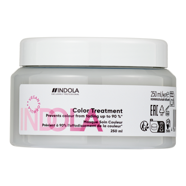 Третман наменет за нега на бојадисаната коса, со идеално ниво на pH 4.5 вредност со до 90% задржување на бојата по 30 миења.Со веганска алтернатива на кератин, INDOLA Color Treatment е интензивен третман за заштита на бојата на косата, формулиран со идеално ниво на pH од 4.5 за да ја заклучи бојата во косата додека обезбедува длабинска нега. Ова спречува избледување на бојата, за до 90% задржување на бојата дури и по 30 миења* – зголемувајќи ја вибрантноста на бојата и обезбедувајќи извонреден сјај. Веганска формула.Обезбедува сјај на бојадисаната и оштетена и порозна коса. Начин на употреба: Користете го третманот за заштита на бојата на косата по користење на шампонот од истата линија Indola Color. Се користи на коса исушена со пешкир и со нежна масажа длабински и рамномерно нанесете од третманот. За неделна употреба, оставете да делува 5-10 минути и потоа темелно да исплакнете. За дневна употреба, мала количина од третманот може да се користи без исплакнување.