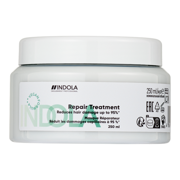 Третман наменет за интензивна и длабинска обнова на косата кај екстремно оштетена и хемиски третирана коса. Формулирана со веганска алтернатива на кератин, INDOLA Intense Repair Mask е маска за коса која продира длабоко во структурата на слабата, екстремно оштетена и хемиски третирана коса за интензивна обнова. Ја обновува внатрешноста на влакното, а воедно обезбедува заштита од кршливост на косата до 95%. Веганска формула**. Начин на употреба: Користете ја маската за интензивна обнова на косата еднаш или двапати неделно претходно измиена со Indola Repair Shampoo. Нанесете на коса исушена со пешкир, оставете да делува 5-10 минути и темелно исплакнете.