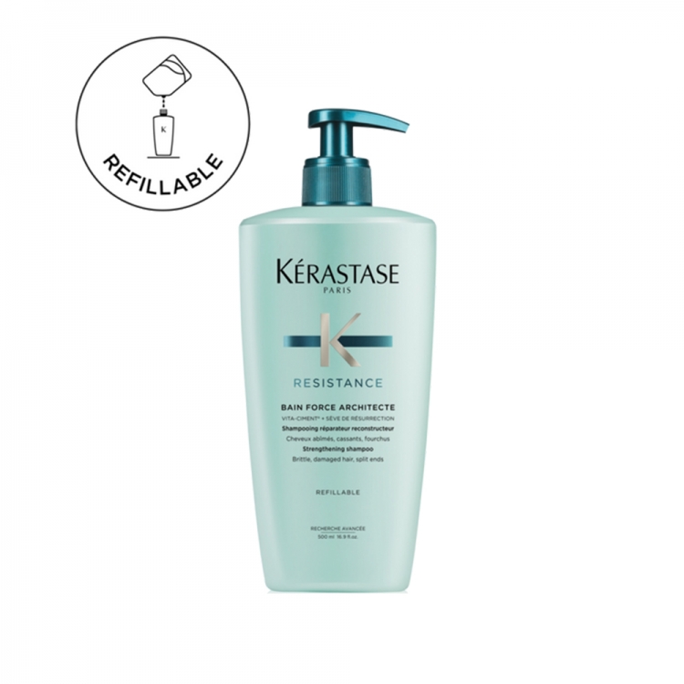 Bain Force Architecte е шампон дизајниран за ослабена и оштетена коса. Го реструктуира влакното и го штити од понатамошни оштетувања. Шампонот од 500мл може повторно да се полни со соодветниот еко-refill во кесичка.