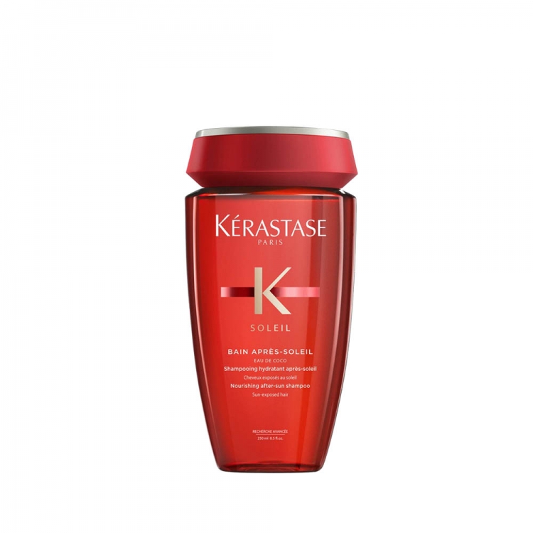 Шампон за нега на коса по изложеност на сонце збогатена со кокосова вода, која нежно ги отстранува хлорот, солта и остатоците од песок, чистејќи ја косата од нивните ефекти на сушење. Нанесен на мокра коса, проѕирниот гел пени, и го чисти скапот и должината на косата, за длабинско ладење и хидрирачки ефект. Косата е хидрирана, инстантно освежена, сјајна и мазна. Мирисот трае долго, оставајќи ве со сјајна коса и лесен летен мирис на јасмин и тубероза.Начин на употреба:Нанесете го шампонот на мокра коса по изложувањето на сонце и масирајте нежно. Исплакнете темелно. Направете две шампонирања пред да ја нанесете Après-Soleil маската за коса.Третира (тип на проблем):Штетни влијанија по изложување на косата на сонцеЕфект (главни придобивки од производот):40%* похидратирана и понахранета коса; ја чисти косата од сол, хлор и остатоци од песок; разладувачки ефект на скалпот; го враќа сјајотРок на употреба (од отварање): 12 месеци