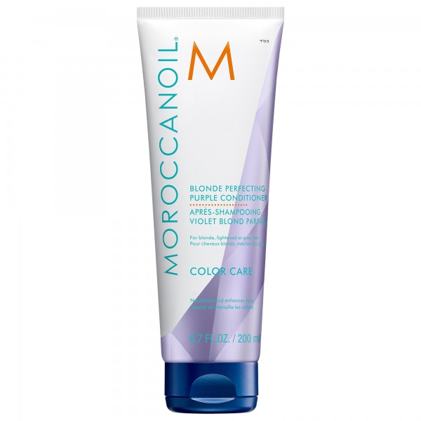 Виолетов кондиционер за нега и неутрализирање на непосакуваните топли тонови боја кај плава, бланширана и седа коса.Со длабоки виолетови пигменти за да се спротивстават на несаканите жолти и портокалови тонови, овој кондиционер за корекција на тон со професионална јачина ви помага да ја одржите вашата идеална ледена плава боја на коса. Нежната формула содржи ArganID™ за да помогне во обновувањето на косата од внатре кон надвор , плус мешавината од аминокиселини за да се подобри задржувањето на бојата и да се подобри сјајот. Резултат: посветла, посјајна боја и поздрав изглед и чувство. Начин на употреба: По шампонирањето со шампонот Moroccanoil Blonde Perfecting Purple, масирајте во косата 1-2 минути. За засилено тонирање, оставете да делува до 5 минути. Добро исплакнете.